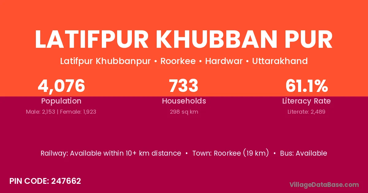 Roorkee (19 km) is the nearest town to Latifpur Khubban Pur village for major economic activities and is located approximately 19 km away.