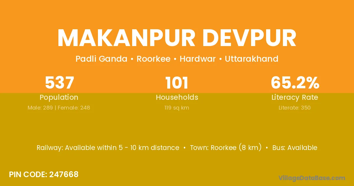 Roorkee (8 km) is the nearest town to Makanpur Devpur village for major economic activities and is located approximately 8 km away.