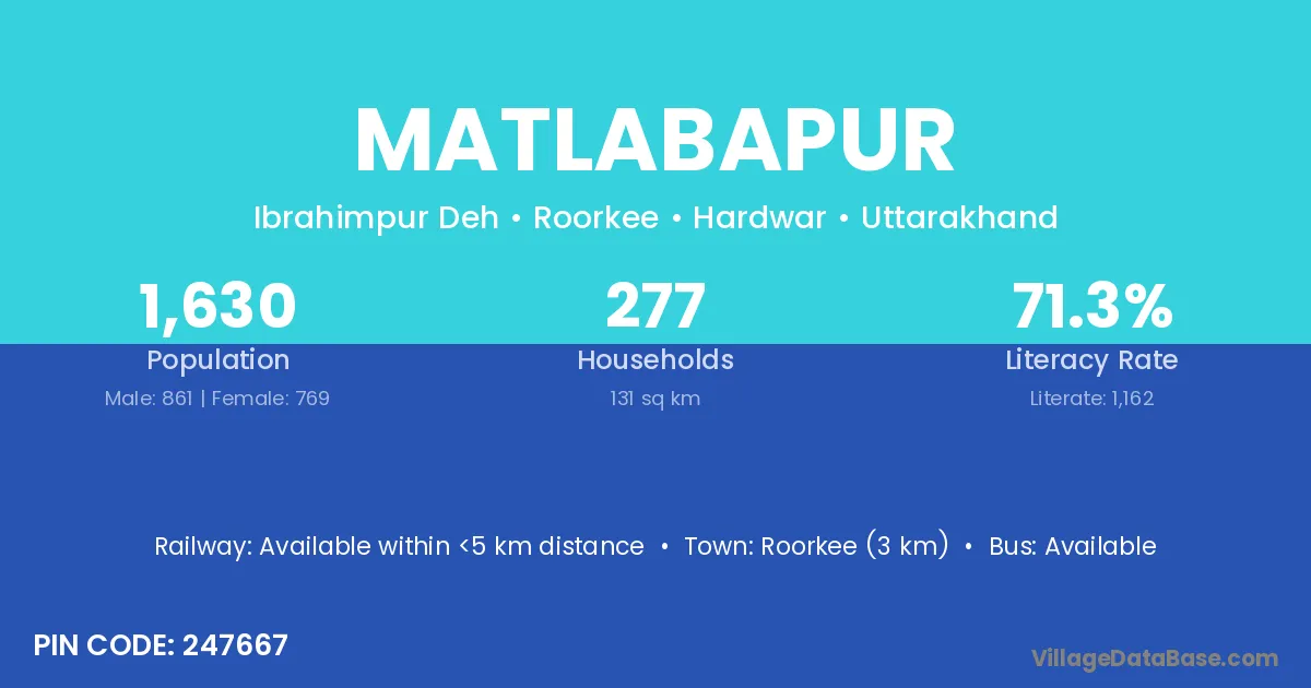 Roorkee (3 km) is the nearest town to Matlabapur village for major economic activities and is located approximately 3 km away.