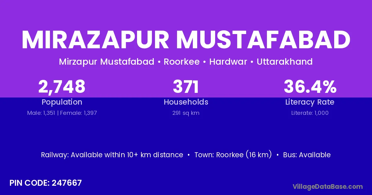 Roorkee (16 km) is the nearest town to Mirazapur Mustafabad village for major economic activities and is located approximately 16 km away.