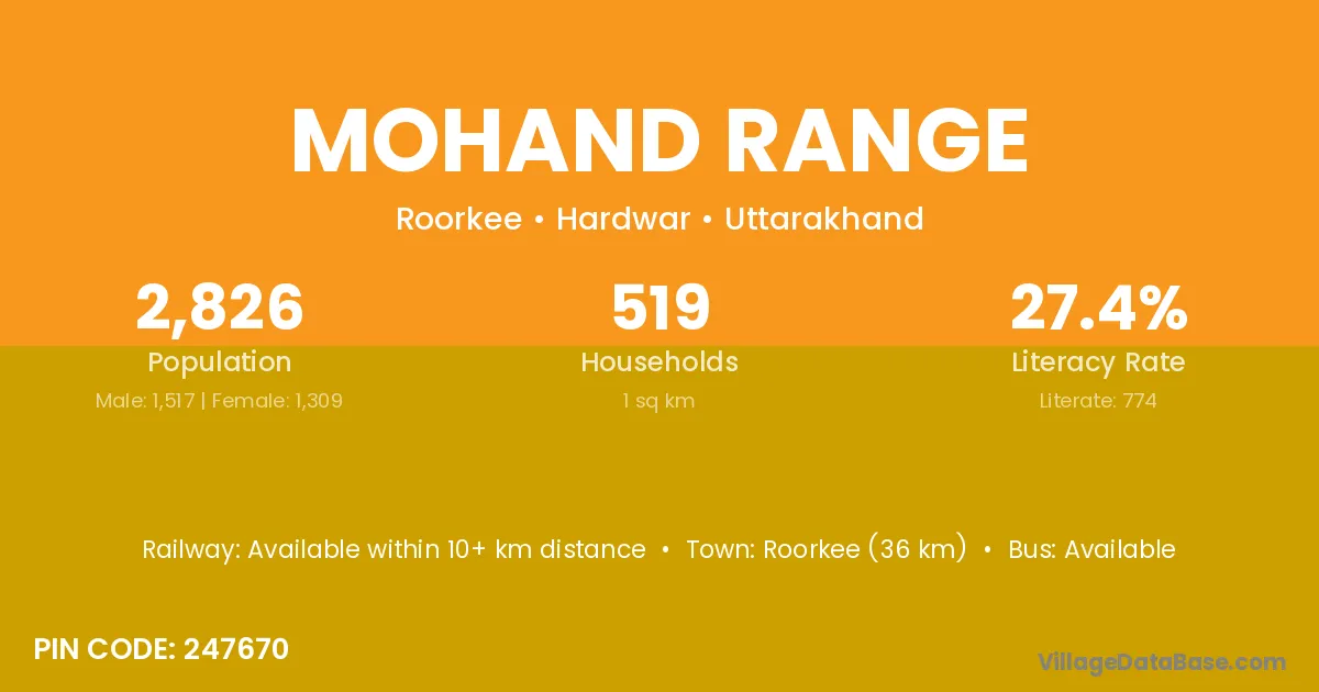Roorkee (36 km) is the nearest town to Mohand Range village for major economic activities and is located approximately 36 km away.