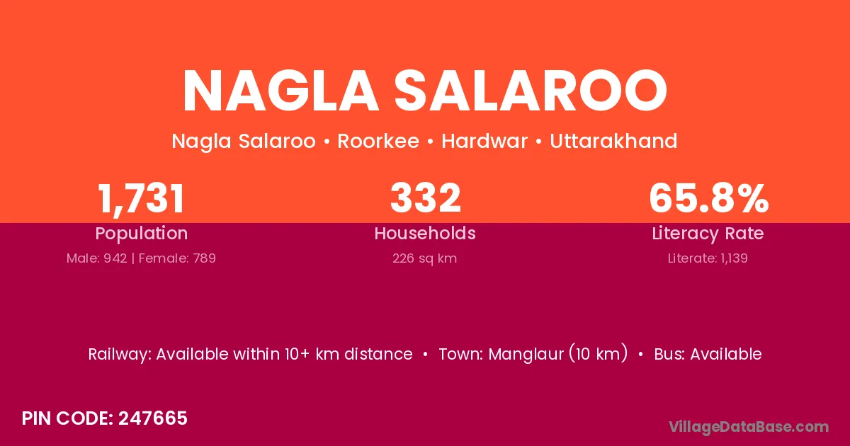 Manglaur (10 km) is the nearest town to Nagla Salaroo village for major economic activities and is located approximately 10 km away.
