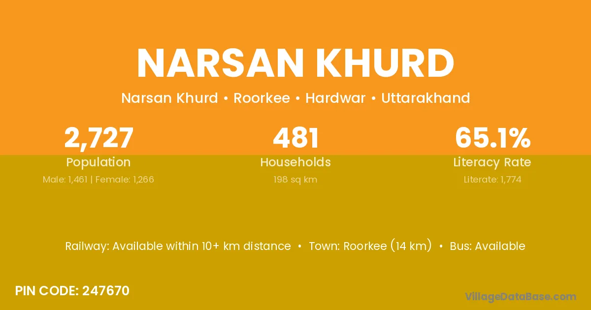 Roorkee (14 km) is the nearest town to Narsan Khurd village for major economic activities and is located approximately 14 km away.