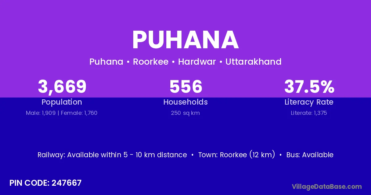 Roorkee (12 km) is the nearest town to Puhana village for major economic activities and is located approximately 12 km away.