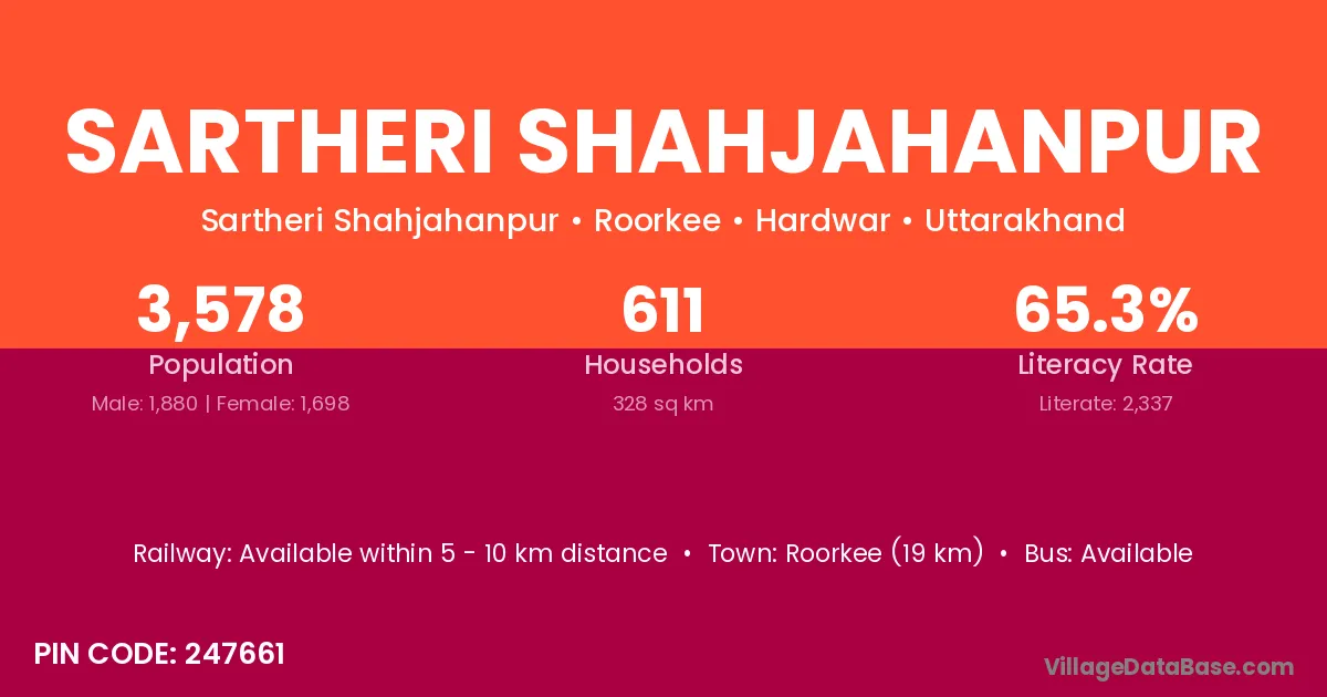 Roorkee (19 km) is the nearest town to Sartheri Shahjahanpur village for major economic activities and is located approximately 19 km away.