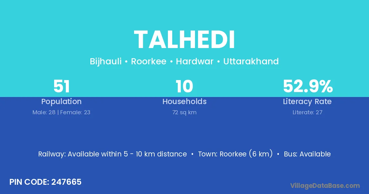 Roorkee (6 km) is the nearest town to Talhedi village for major economic activities and is located approximately 6 km away.