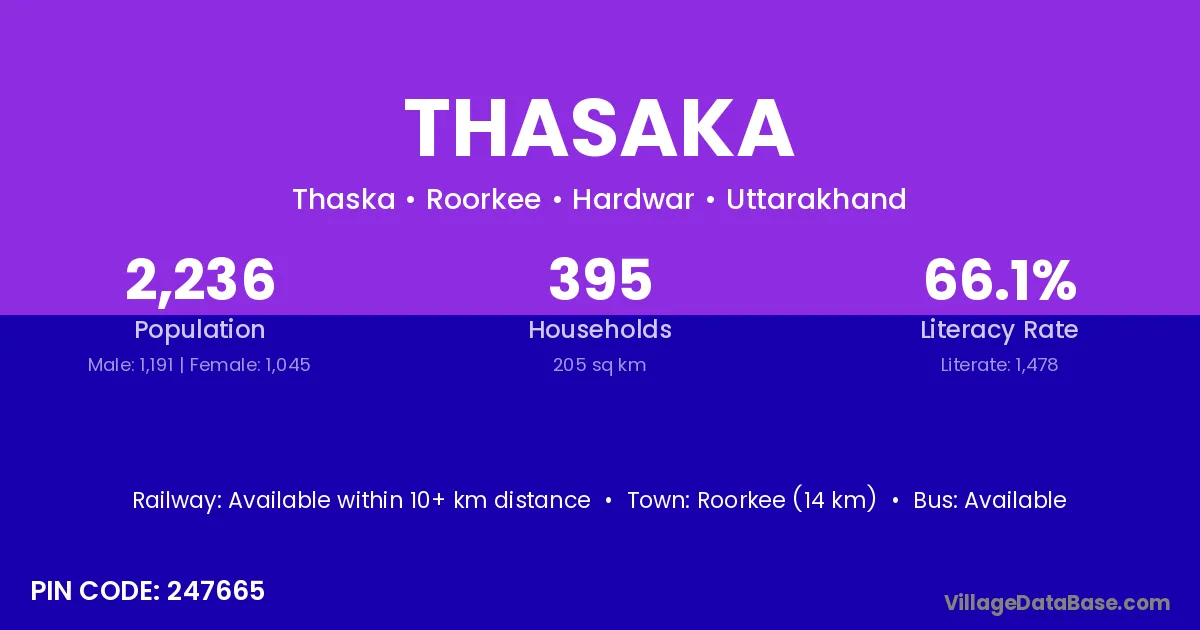 Roorkee (14 km) is the nearest town to Thasaka village for major economic activities and is located approximately 14 km away.