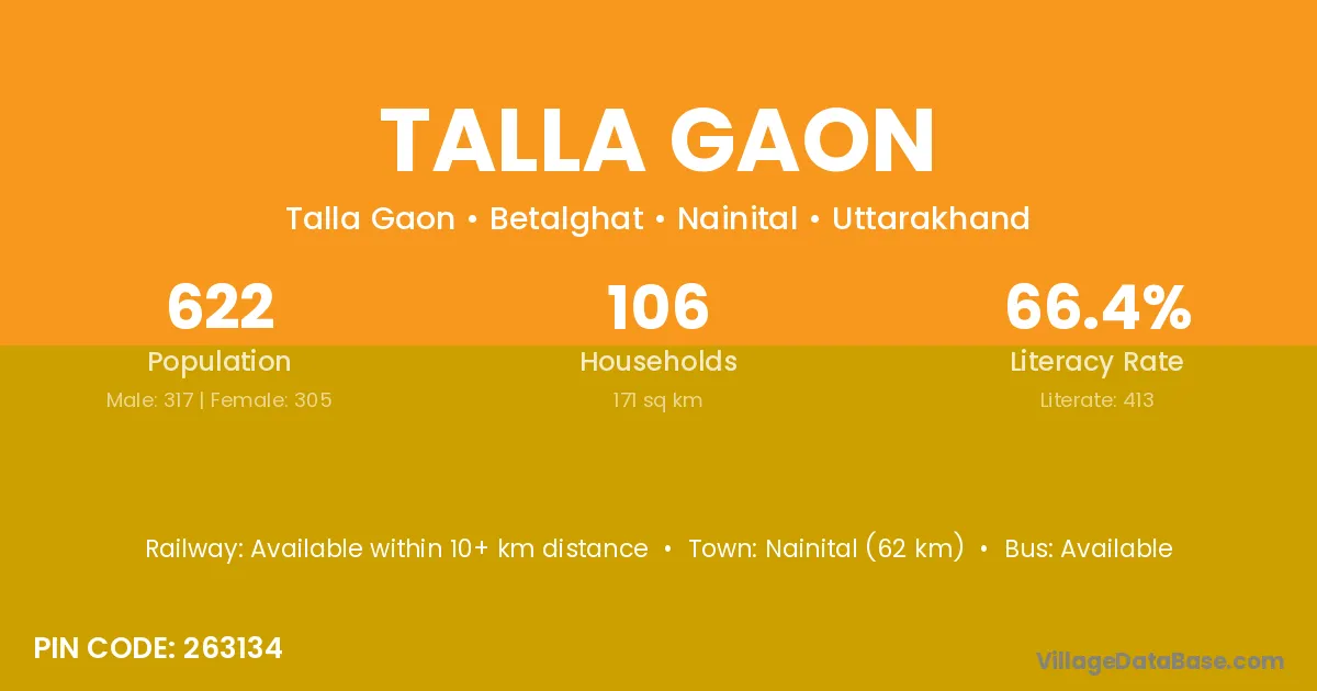 Talla Gaon village has a total population of 622 people, of which 317 are males and 305 are females.