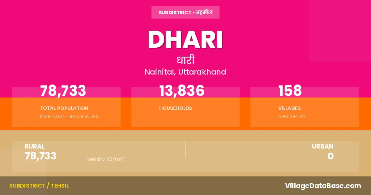 Dhari is a town and Tehsil in the Nainital district of the Uttarakhand. In India, a Tehsil is a subdivision of a district responsible for the administration and revenue collection of a specific area within the district. Tehsils play a crucial role in the local governance structure, contributing significantly to the development and administration of their communities.