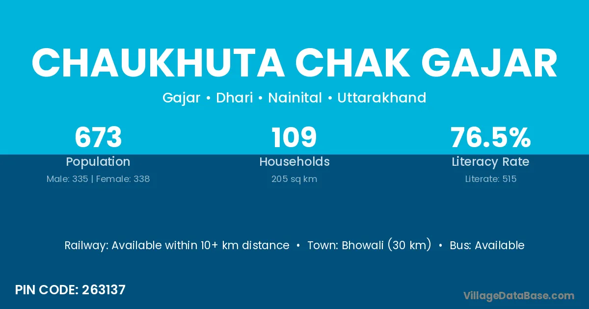 Bhowali (30 km) is the nearest town to Chaukhuta Chak Gajar village for major economic activities and is located approximately 30 km away.