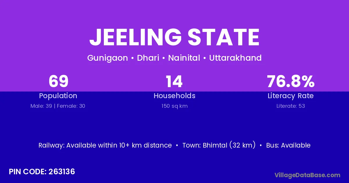 Bhimtal (32 km) is the nearest town to Jeeling State village for major economic activities and is located approximately 32 km away.