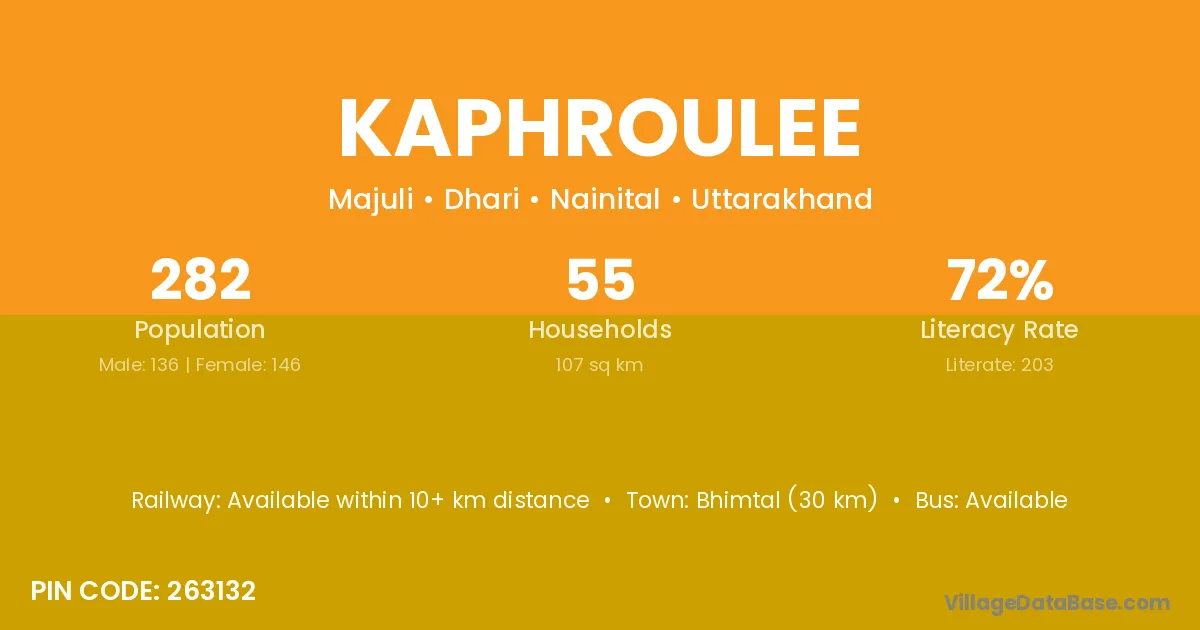 Bhimtal (30 km) is the nearest town to Kaphroulee village for major economic activities and is located approximately 30 km away.