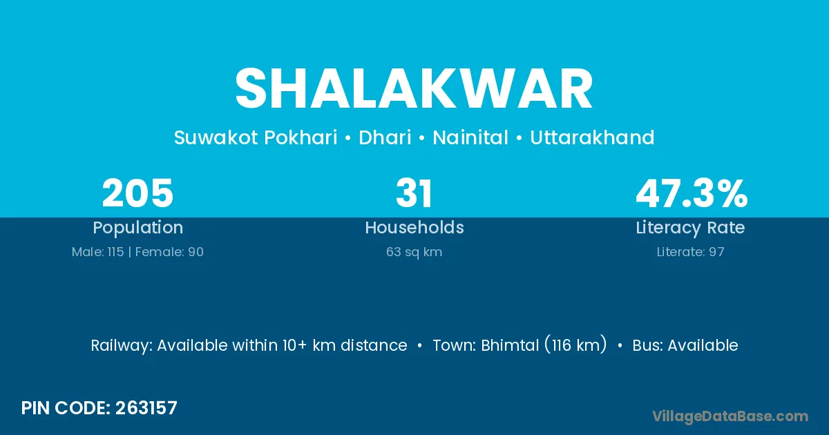 Bhimtal (116 km) is the nearest town to Shalakwar village for major economic activities and is located approximately 116 km away.