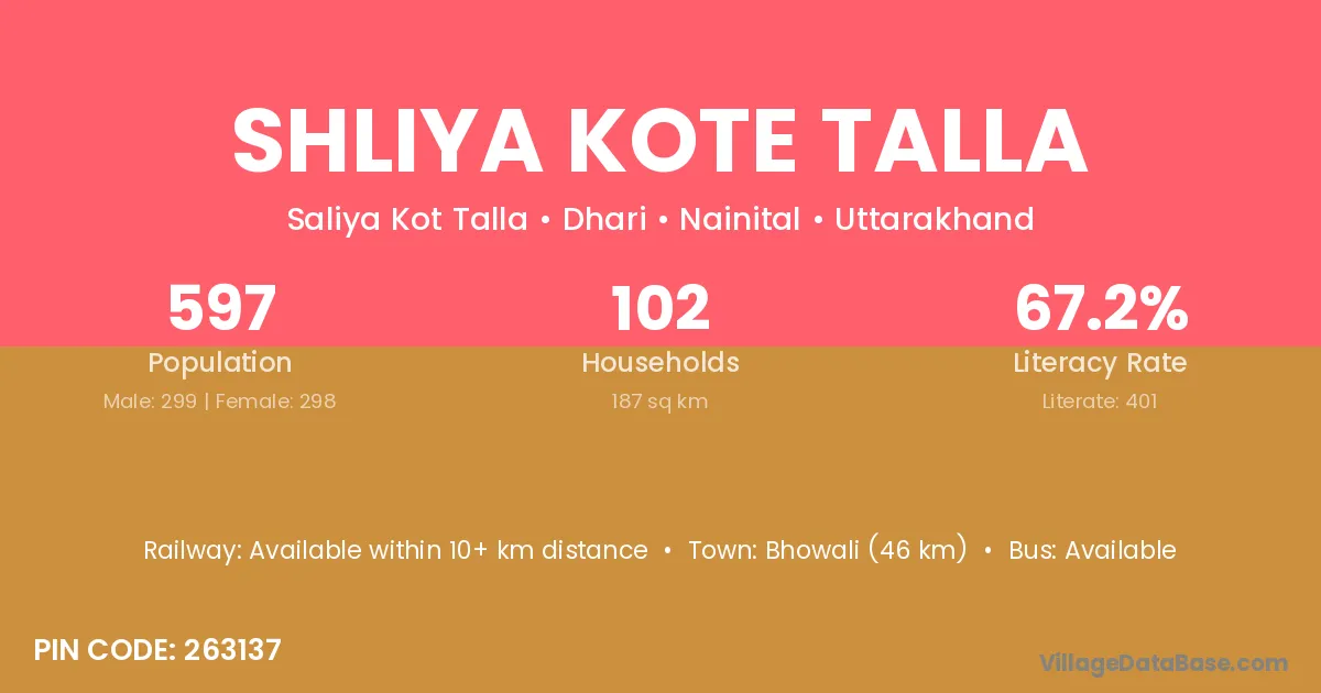 Shliya Kote Talla village has a total population of 597 people, of which 299 are males and 298 are females.