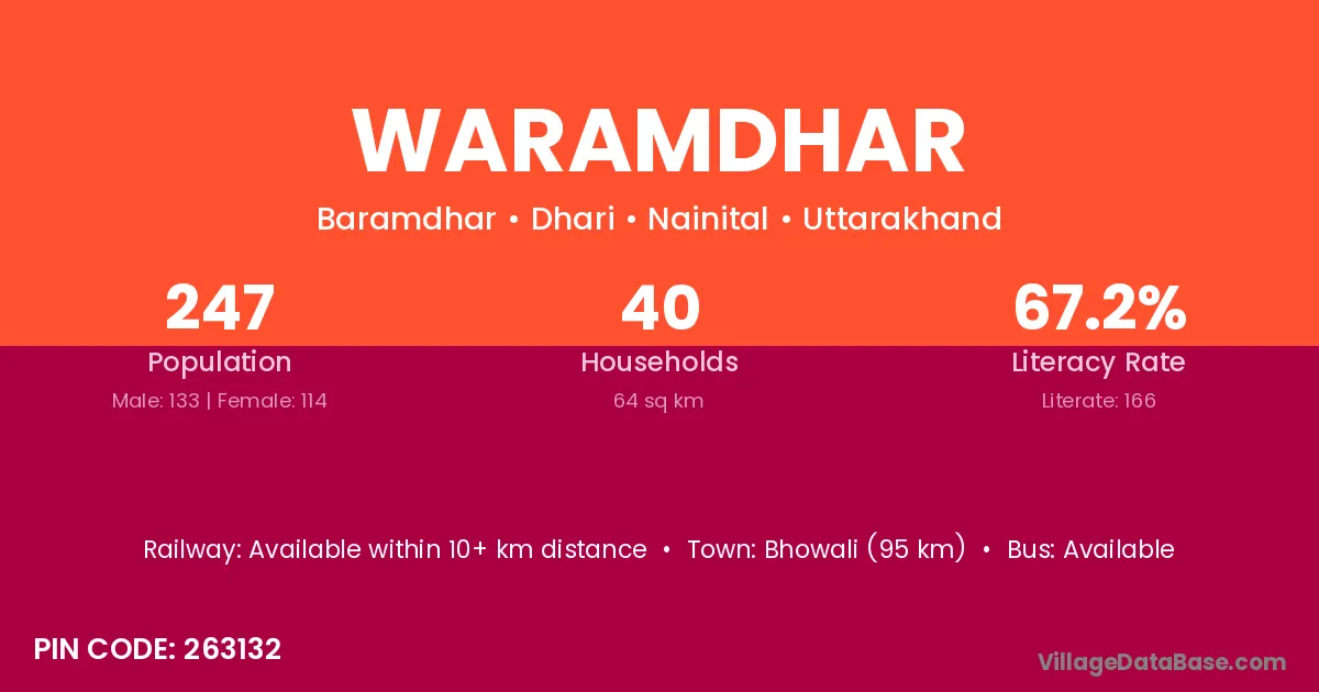 Bhowali (95 km) is the nearest town to Waramdhar village for major economic activities and is located approximately 95 km away.