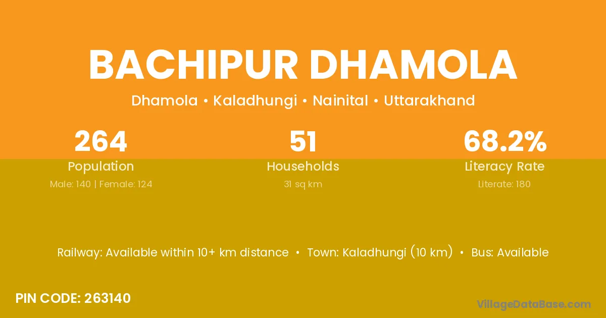 Bachipur Dhamola village has a total population of 264 people, of which 140 are males and 124 are females.