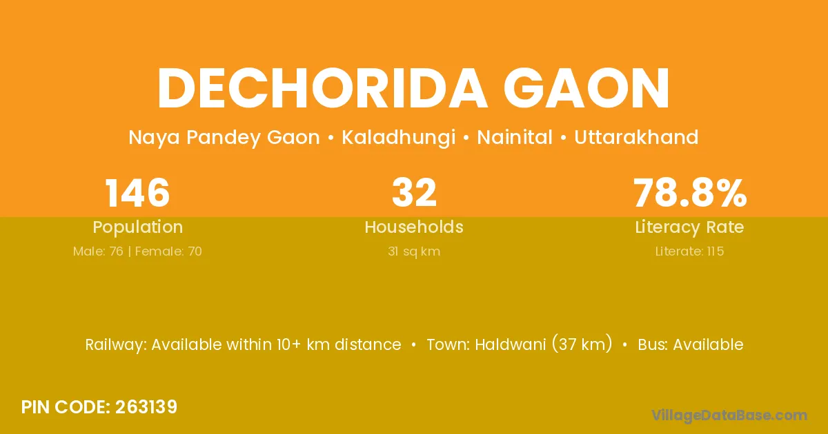Haldwani (37 km) is the nearest town to Dechorida Gaon village for major economic activities and is located approximately 37 km away.