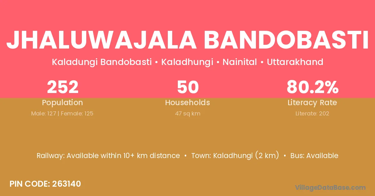 Kaladhungi (2 km) is the nearest town to Jhaluwajala Bandobasti village for major economic activities and is located approximately 2 km away.