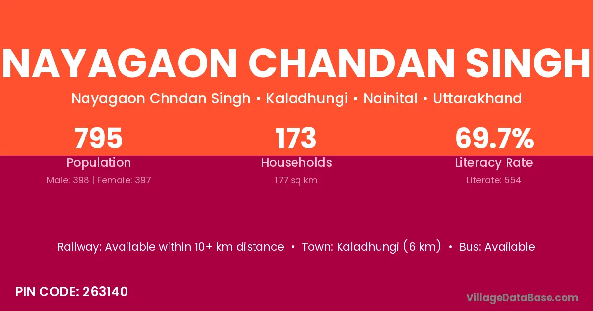 Kaladhungi (6 km) is the nearest town to Nayagaon Chandan Singh village for major economic activities and is located approximately 6 km away.