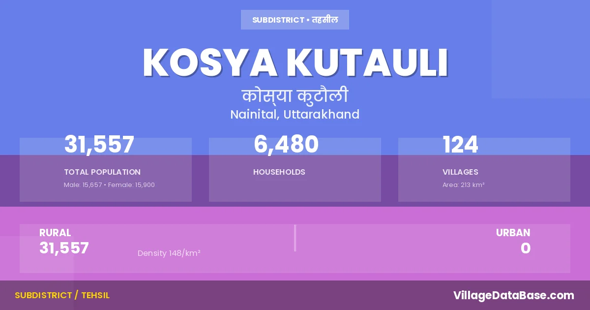According to the 2011 census The total area of Kosya Kutauli Tehsil is 213 km², with a population of 31557 people. The population density is 148 inhabitants per square kilometre, and there are approximately 6480 houses in the sub district.