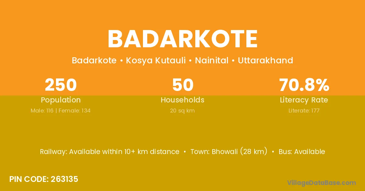 Bhowali (28 km) is the nearest town to Badarkote village for major economic activities and is located approximately 28 km away.