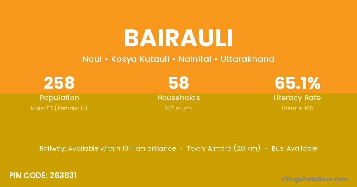 Almora (28 km) is the nearest town to Bairauli village for major economic activities and is located approximately 28 km away.