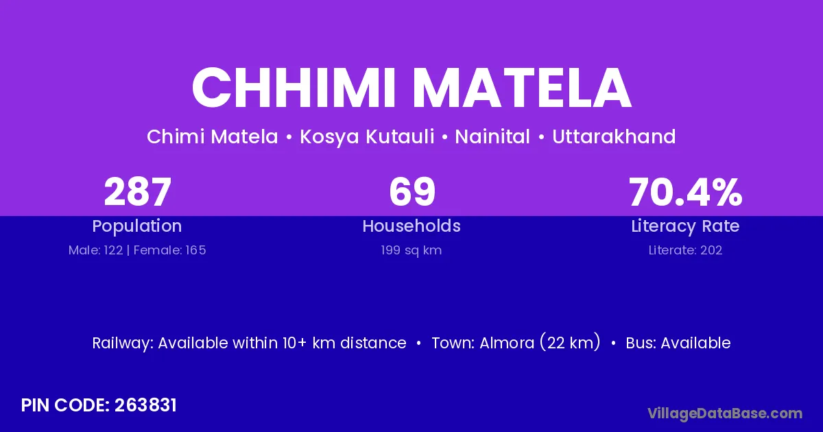 Almora (22 km) is the nearest town to Chhimi Matela village for major economic activities and is located approximately 22 km away.