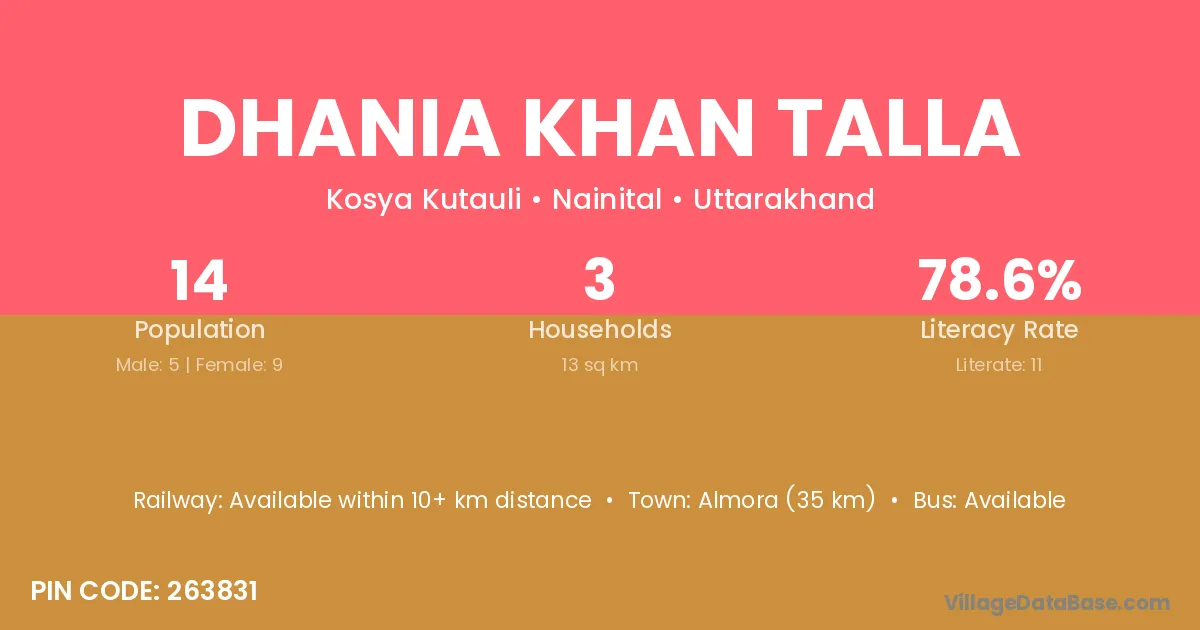 Almora (35 km) is the nearest town to Dhania Khan Talla village for major economic activities and is located approximately 35 km away.