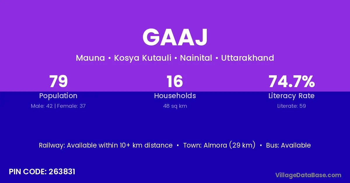 Almora (29 km) is the nearest town to Gaaj village for major economic activities and is located approximately 29 km away.
