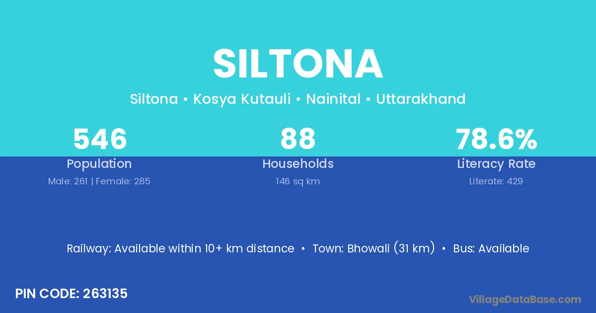 Bhowali (31 km) is the nearest town to Siltona village for major economic activities and is located approximately 31 km away.