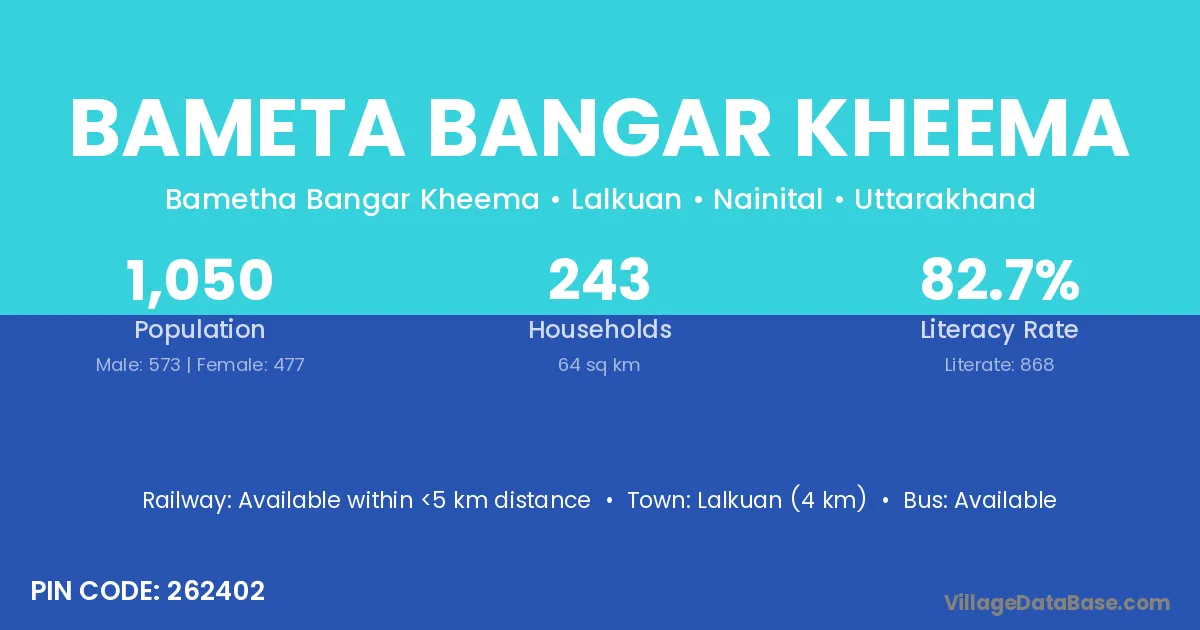 Lalkuan (4 km) is the nearest town to Bameta Bangar Kheema village for major economic activities and is located approximately 4 km away.