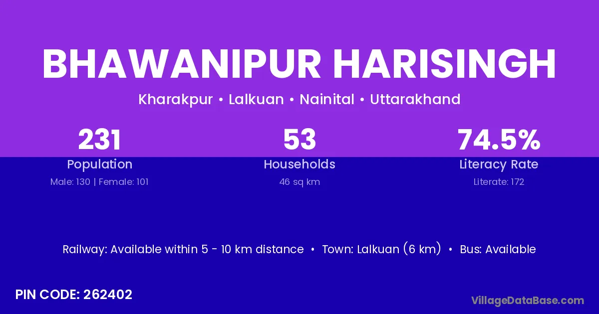 Lalkuan (6 km) is the nearest town to Bhawanipur Harisingh village for major economic activities and is located approximately 6 km away.