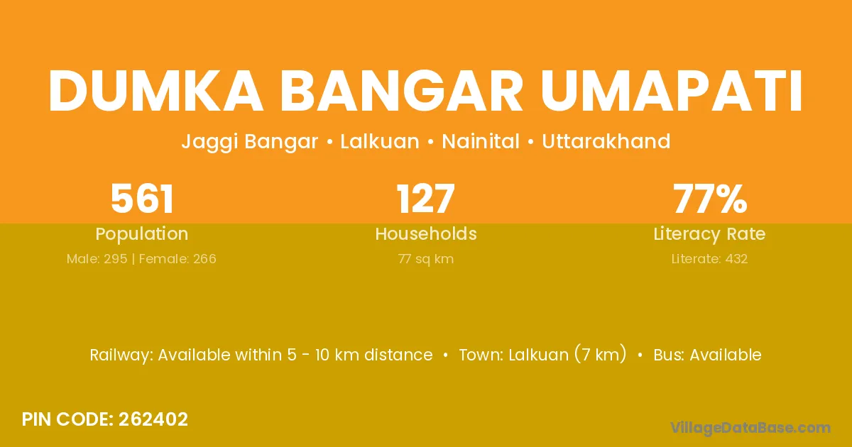 Lalkuan (7 km) is the nearest town to Dumka Bangar Umapati village for major economic activities and is located approximately 7 km away.