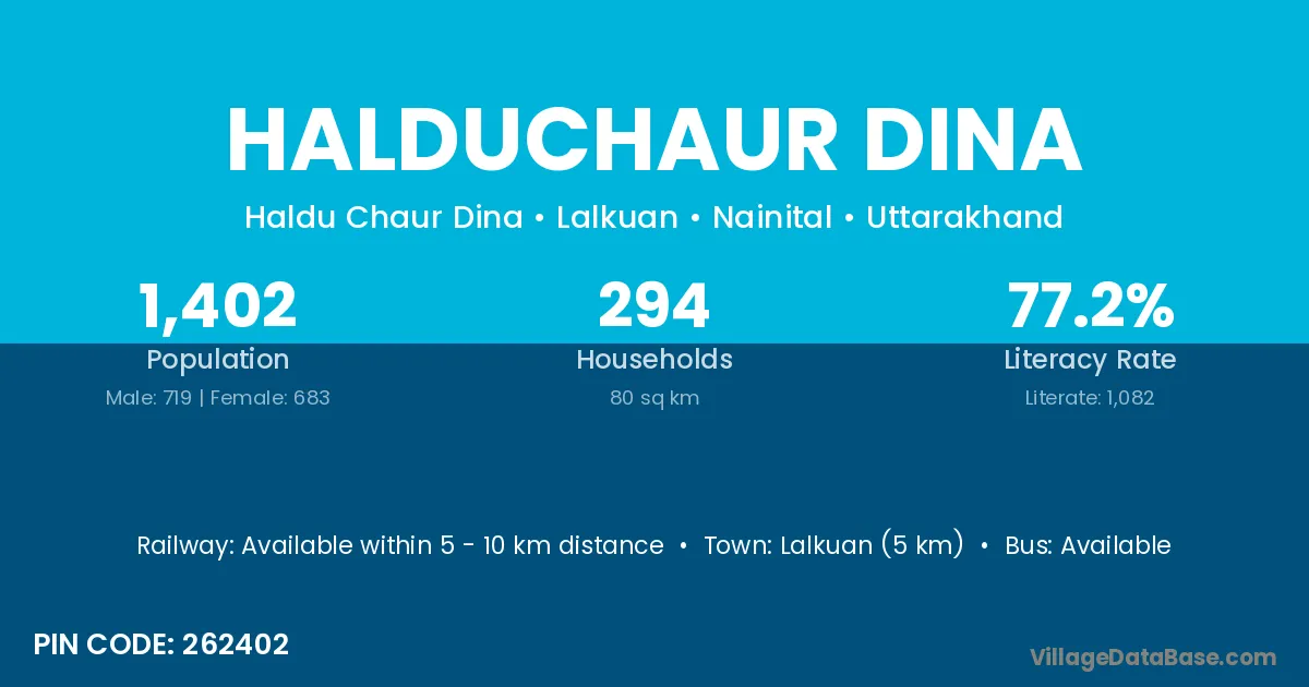 Lalkuan (5 km) is the nearest town to Halduchaur Dina village for major economic activities and is located approximately 5 km away.