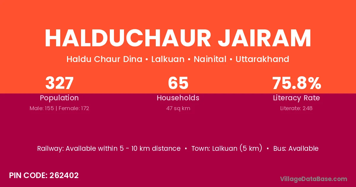 Lalkuan (5 km) is the nearest town to Halduchaur Jairam village for major economic activities and is located approximately 5 km away.