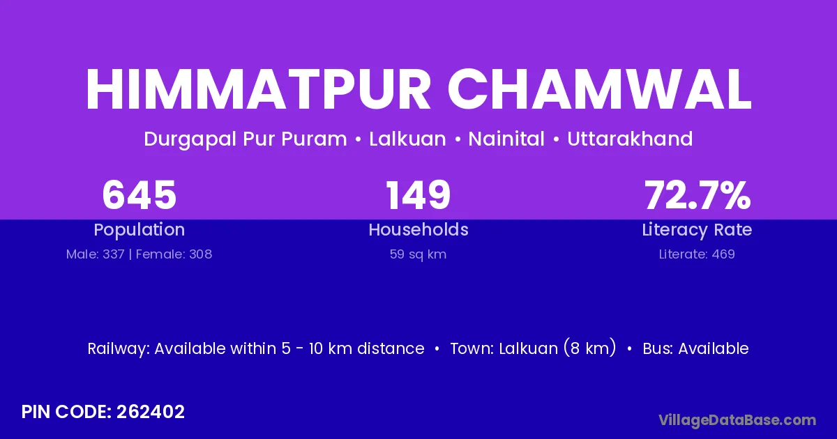 Lalkuan (8 km) is the nearest town to Himmatpur Chamwal village for major economic activities and is located approximately 8 km away.