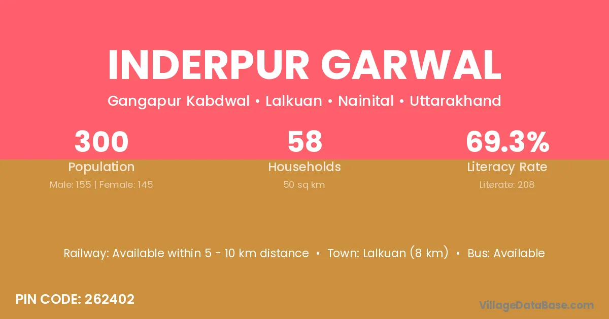 Lalkuan (8 km) is the nearest town to Inderpur Garwal village for major economic activities and is located approximately 8 km away.