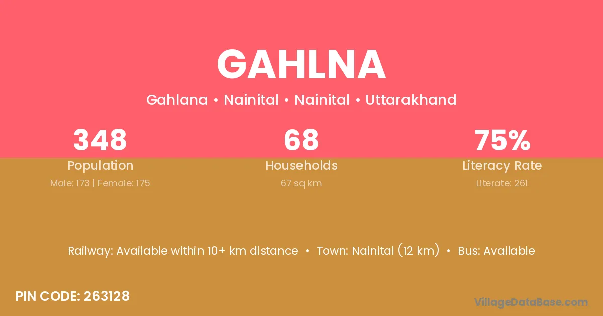 Nainital (12 km) is the nearest town to Gahlna village for major economic activities and is located approximately 12 km away.