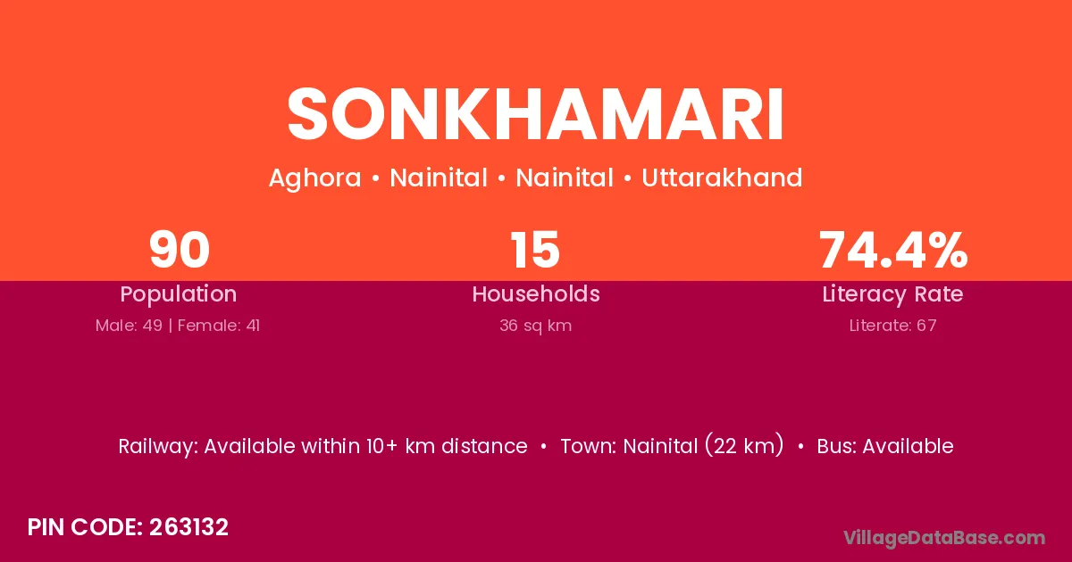 Nainital (22 km) is the nearest town to Sonkhamari village for major economic activities and is located approximately 22 km away.