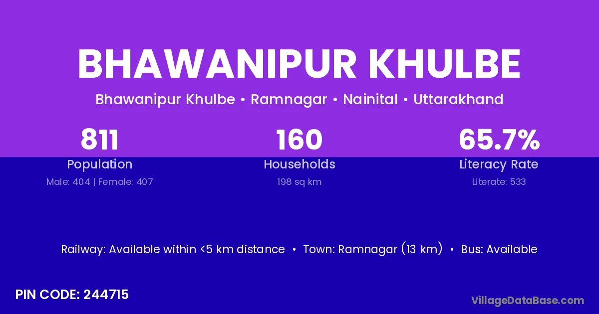 Ramnagar (13 km) is the nearest town to Bhawanipur Khulbe village for major economic activities and is located approximately 13 km away.