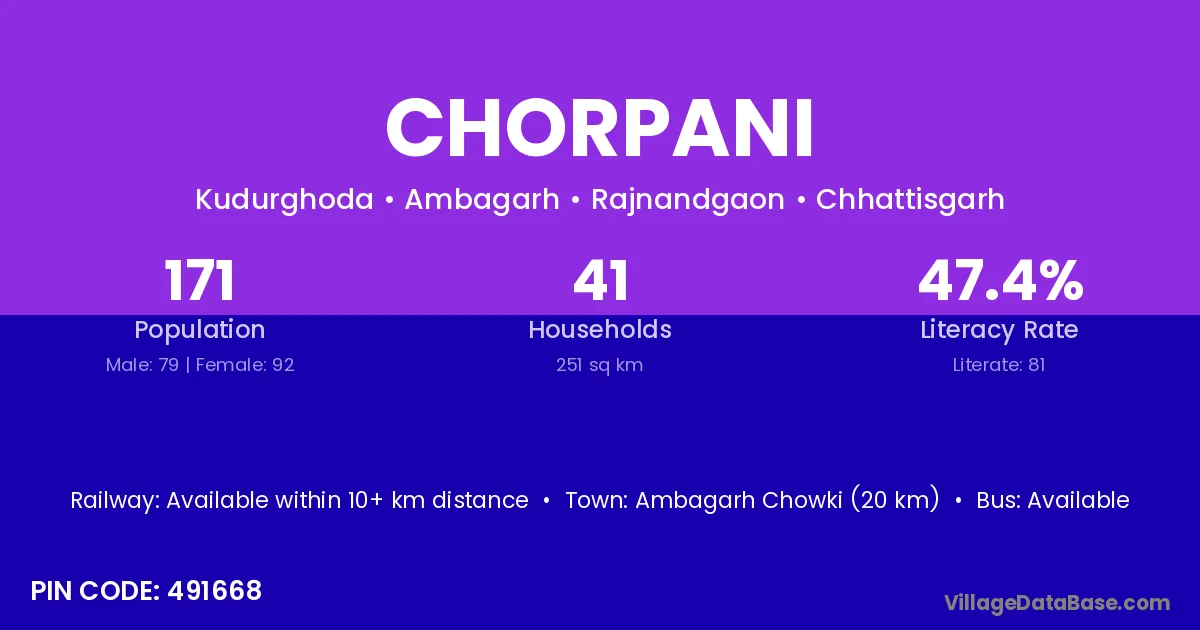 Ramnagar (3 km) is the nearest town to Chorpani village for major economic activities and is located approximately 3 km away.