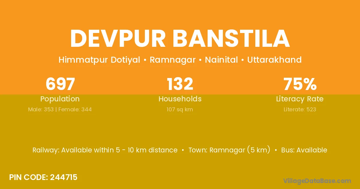 Ramnagar (5 km) is the nearest town to Devpur Banstila village for major economic activities and is located approximately 5 km away.