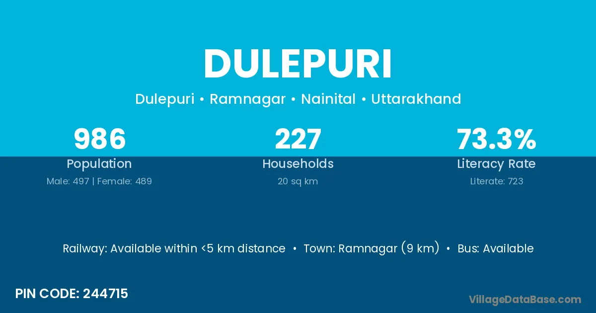 Ramnagar (9 km) is the nearest town to Dulepuri village for major economic activities and is located approximately 9 km away.