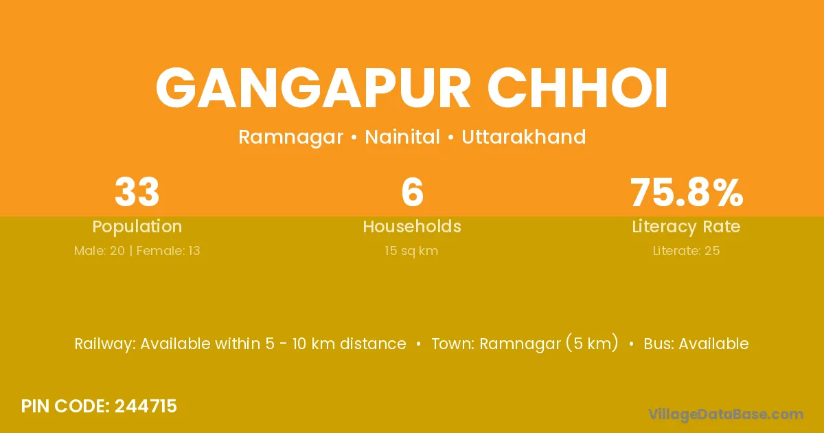 Ramnagar (5 km) is the nearest town to Gangapur Chhoi village for major economic activities and is located approximately 5 km away.