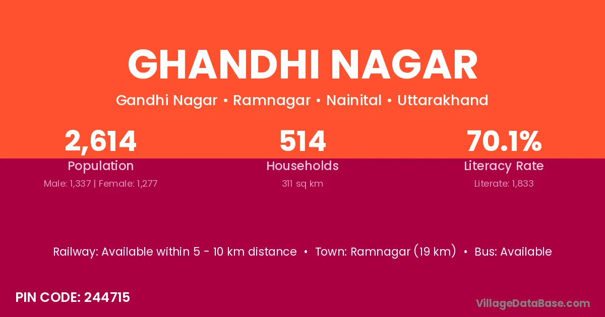 Ramnagar (19 km) is the nearest town to Ghandhi Nagar village for major economic activities and is located approximately 19 km away.