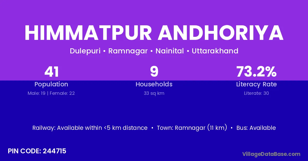 Ramnagar (11 km) is the nearest town to Himmatpur Andhoriya village for major economic activities and is located approximately 11 km away.