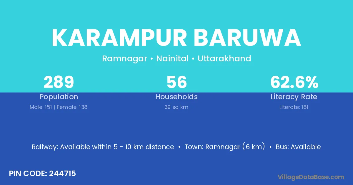 Ramnagar (6 km) is the nearest town to Karampur Baruwa village for major economic activities and is located approximately 6 km away.