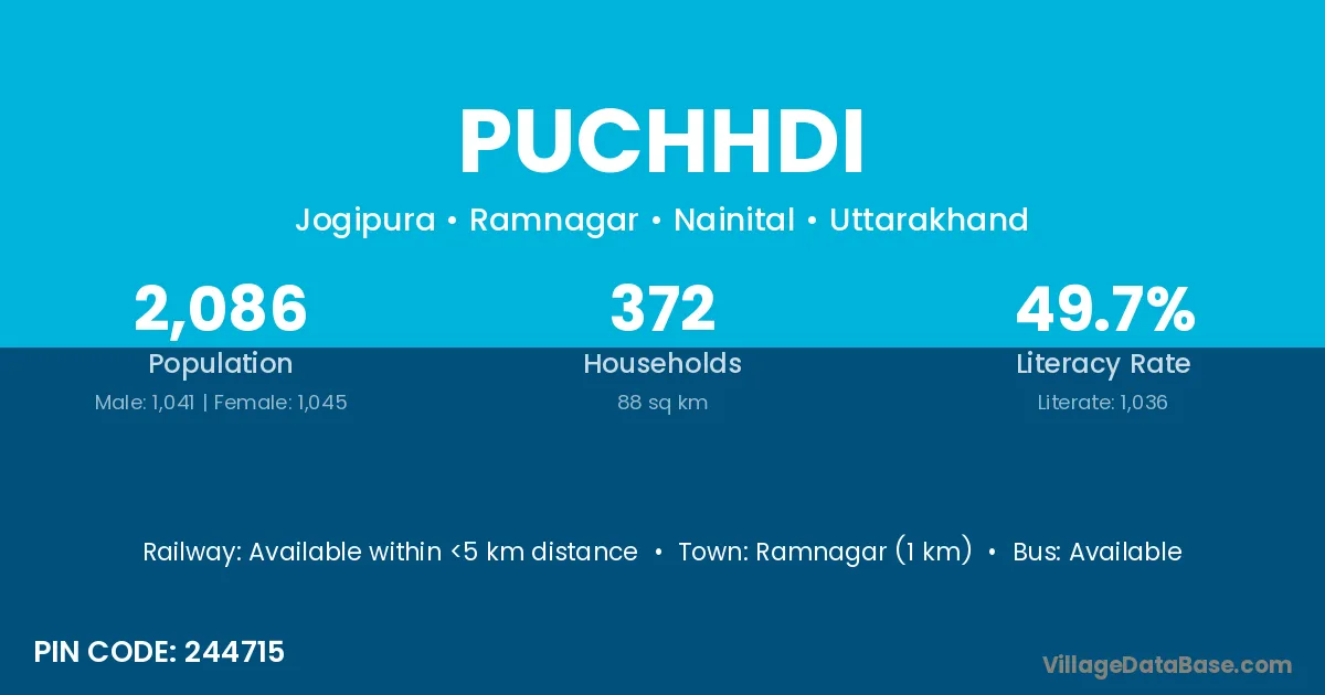 Ramnagar (1 km) is the nearest town to Puchhdi village for major economic activities and is located approximately 1 km away.