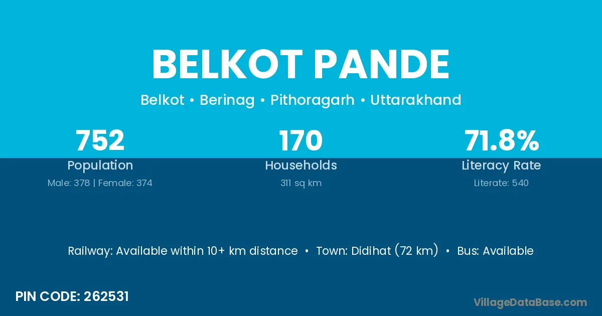 Didihat (72 km) is the nearest town to Belkot Pande village for major economic activities and is located approximately 72 km away.