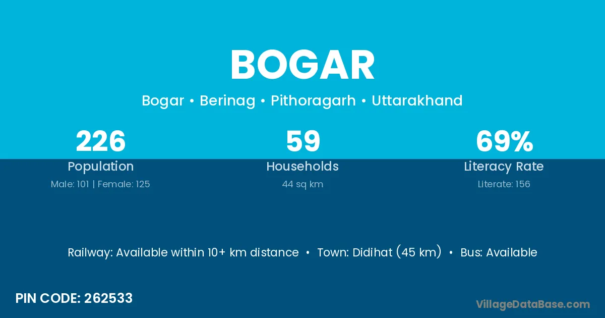 Didihat (45 km) is the nearest town to Bogar village for major economic activities and is located approximately 45 km away.